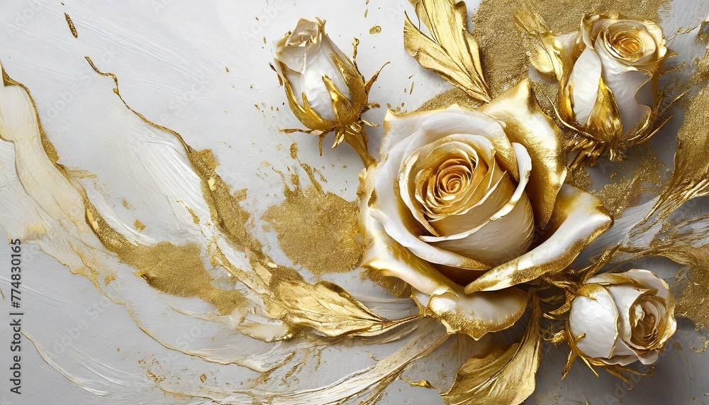 Fototapeta Kwiaty - Biało-złote tło z różami 3D oblane złotą farbą #774830165