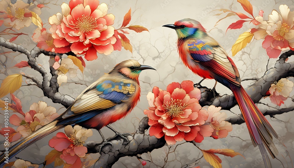 Fototapeta Kwiaty - Egzotyczne, kolorowe ptaki siedzące na drzewie pokrytym kolorowymi kwiatami. Odcienie czerwieni,... #800394419