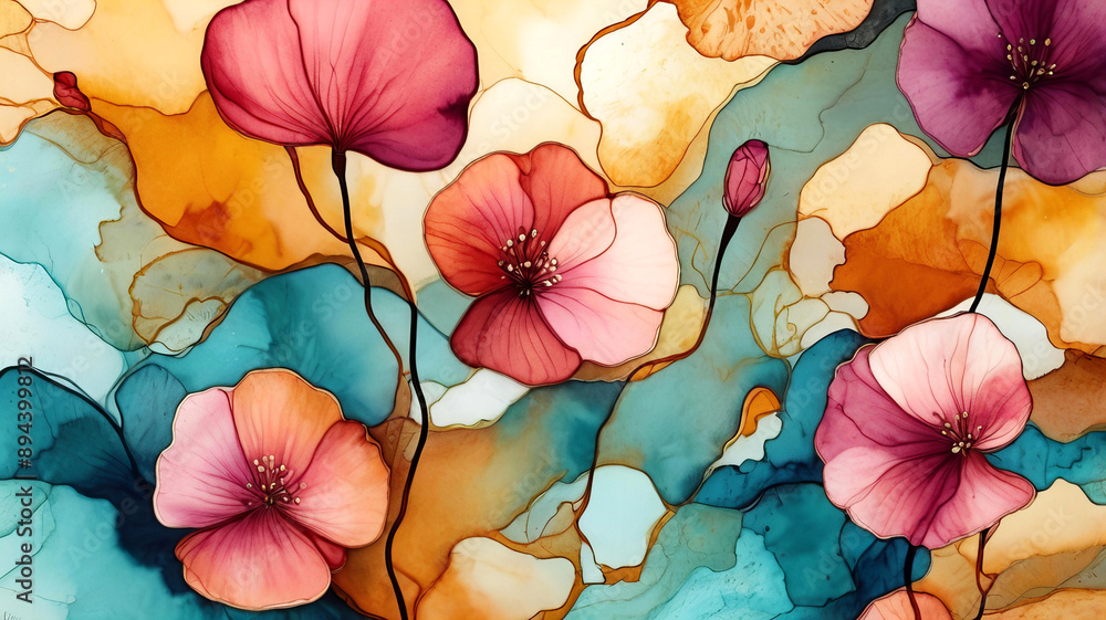 Fototapeta Kwiaty - Piękne akwarelowe kwiaty różnokolorowe, delikatne i nastrojowe. #894399812