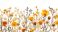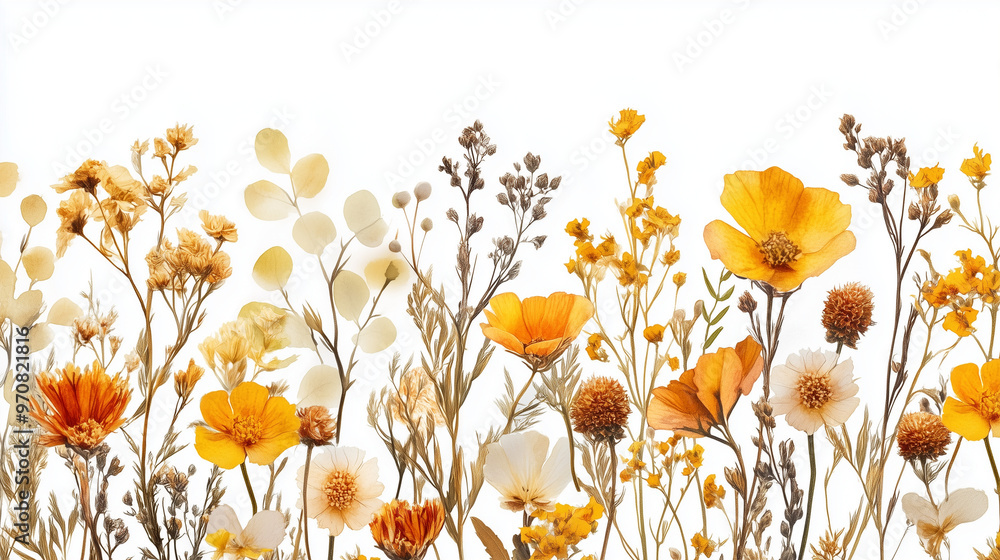 • Kompozycja dzikich kwiatów z wiosny i lata, wysuszonych i ułożonych na białym tle z akwarelowymi akcentami. Żółte i pomarańczowe kwiaty tworzą subtelną i elegancką herbariumową aranżację.