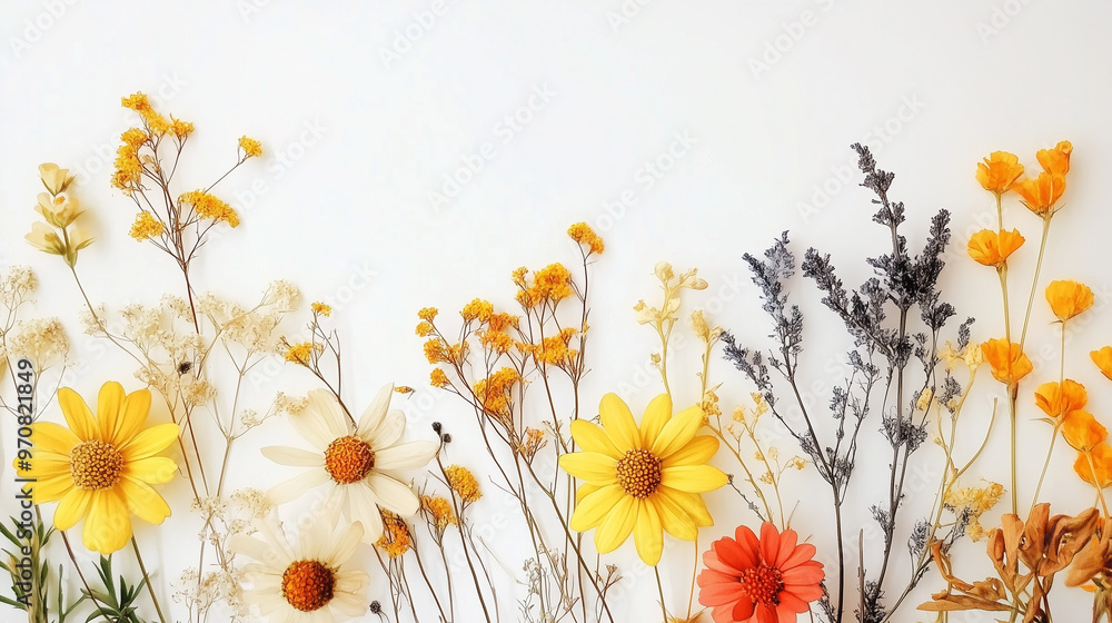 • Kompozycja dzikich kwiatów z wiosny i lata, wysuszonych i ułożonych na białym tle z akwarelowymi akcentami. Żółte i pomarańczowe kwiaty tworzą subtelną i elegancką herbariumową aranżację.