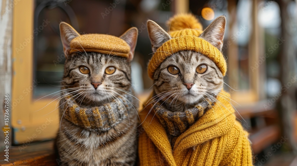 • Two tabby cats dressed in knitted yellow hats and scarves stare forward