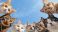 • Group of curious cats with various fur patterns and colors look down at camera against clear blue sky, creating playful and engaging scene
