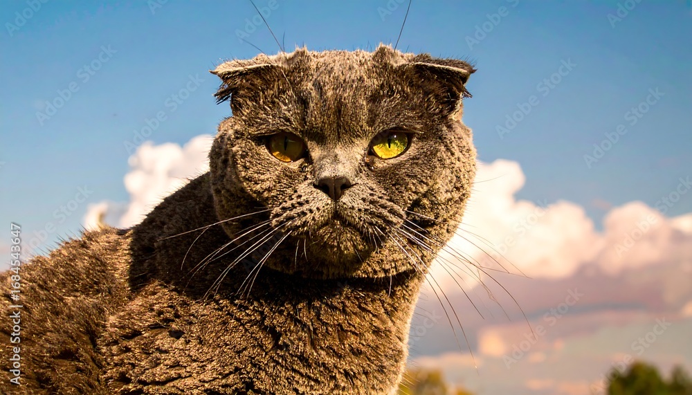 Fototapeta Koty - Grumpy feline portrait against blue sky #1684543647