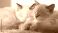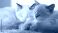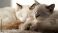• Two cats snuggled together, peacefully sleeping on a soft surface.