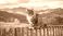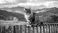 Fototapeta Koty - Majestic feline perched on fence, mountain backdrop #1691661743