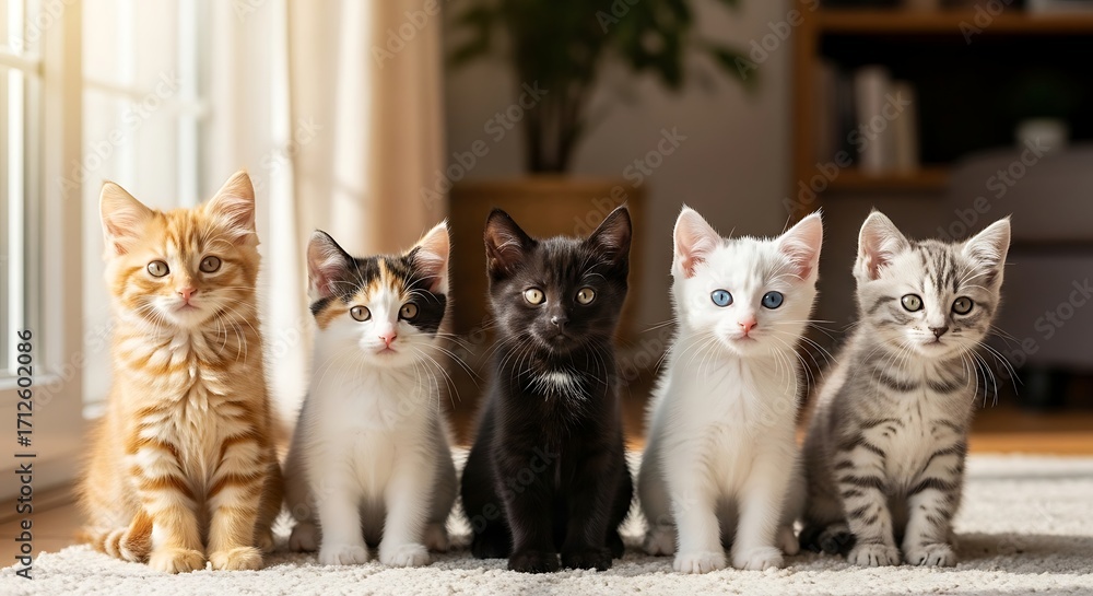 Fototapeta Koty - Five adorable kittens sitting in a row. #1712602086