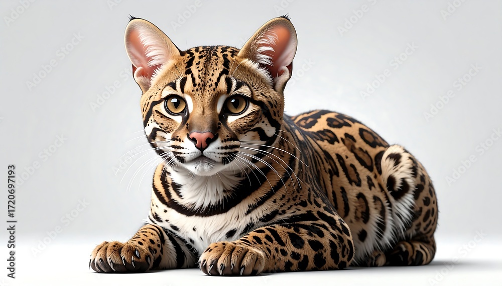 Fototapeta Koty - A spotted feline lies on a neutral background #1720697193
