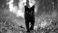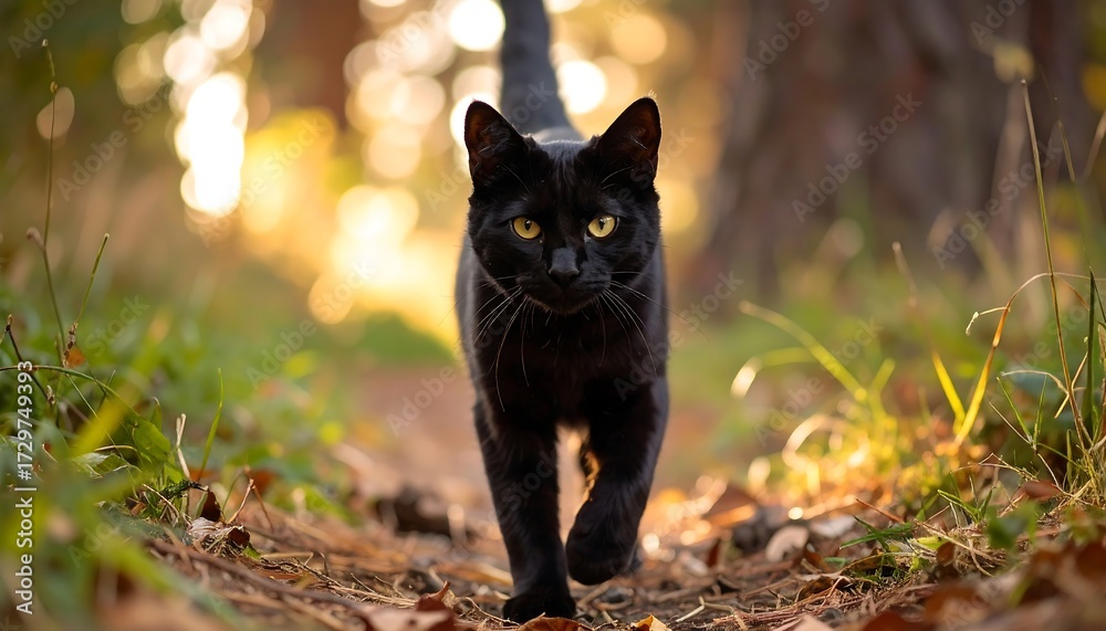 • Black cat walking toward the camera on a forest path, backlit by golden sunlight