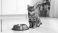 • A tabby cat sits patiently by an empty blue bowl on a wood floor