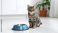 Fototapeta Koty - A tabby cat sits patiently by an empty blue bowl on a wood floor #1745504327