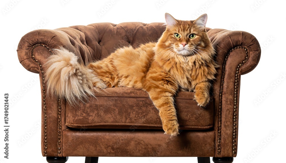 Fototapeta Koty - Orange feline reclining regally on a brown, button-tufted leather armchair #1749021443