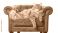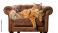 • Orange feline reclining regally on a brown, button-tufted leather armchair