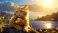 • A fluffy orange feline with golden armor sits atop a rock, overlooking solar panels, mountains, and a sunlit landscape