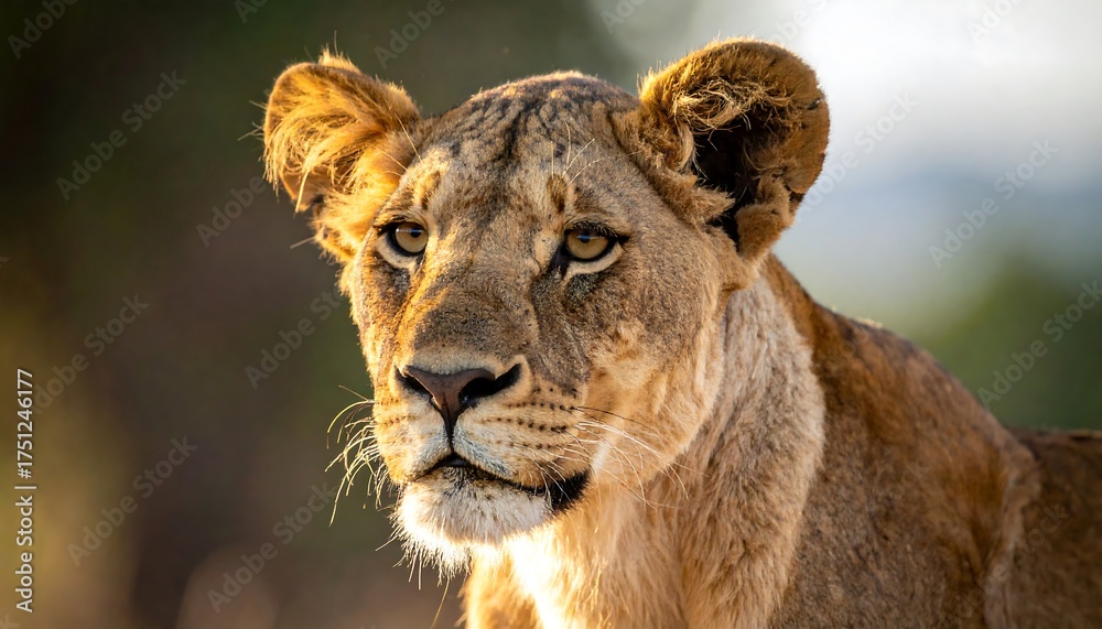 Fototapeta Koty - A detailed portrait of a lioness, bathed in warm sunlight. The majestic feline gazes attentively,... #1751246177