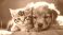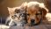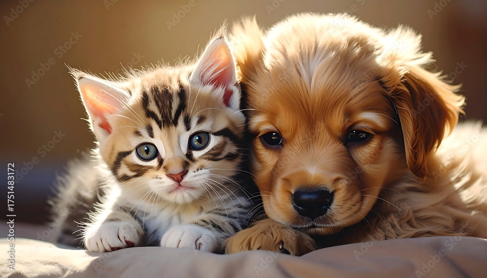• Cute feline kitten nestled beside adorable golden retriever puppy