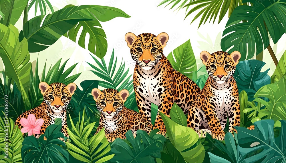 Fototapeta Koty - Four spotted jungle felines with their cubs, nestled in lush greenery #1751788472