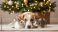 • A cute dog, cat, and rabbit cuddling together in front of a Christmas tree. Unlikely animal friends celebrating the holidays. Pet friendship and togetherness concept
