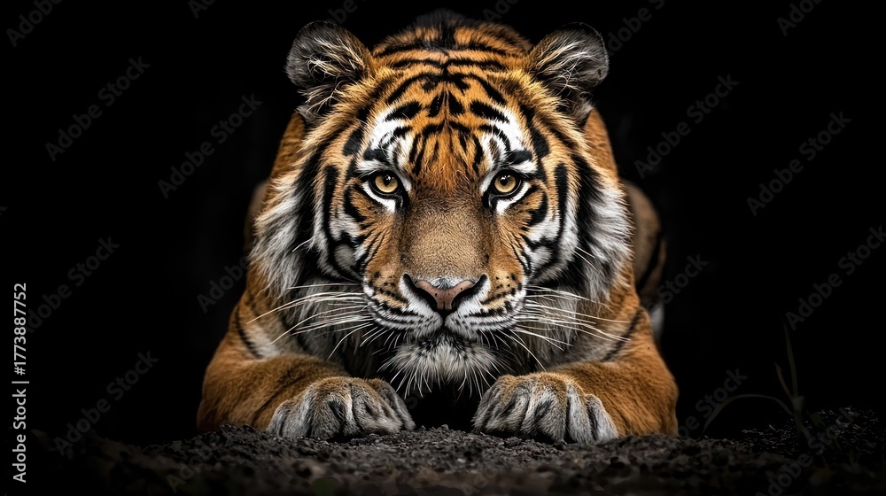 Fototapeta Koty - A tiger with its paws on the ground, looking directly at the camera. #1773887752