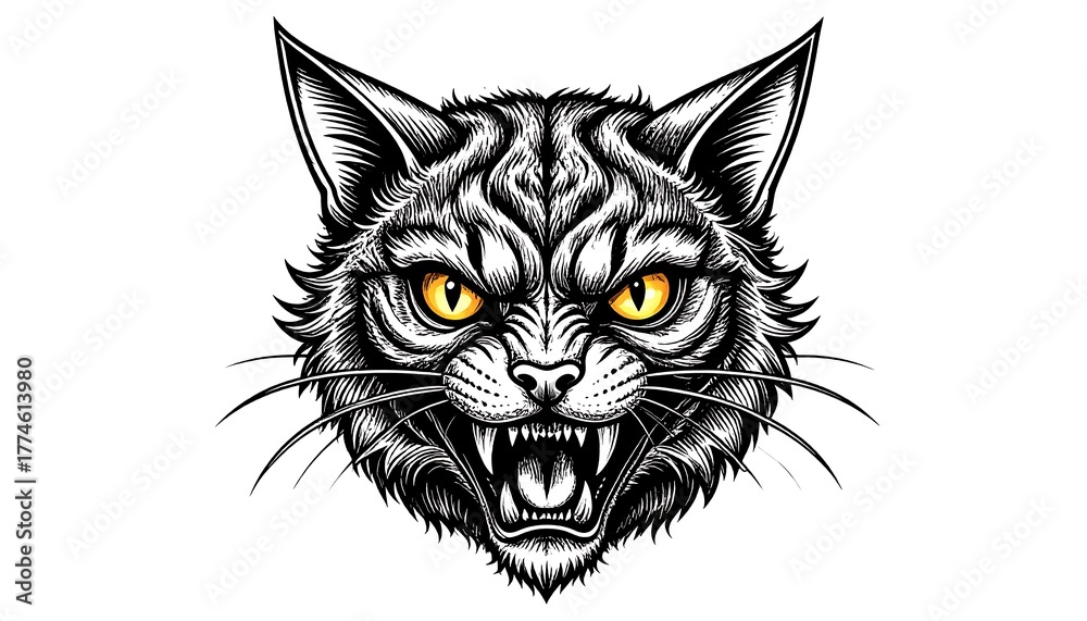 • Intricate grayscale illustration of an enraged feline face with glowing yellow eyes, bared teeth, and detailed fur