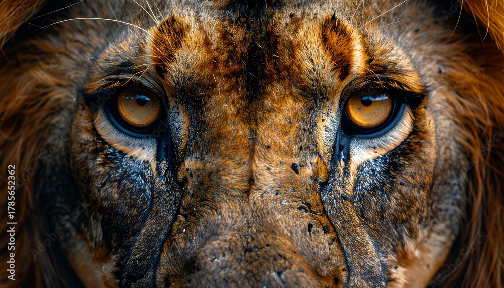 • Majestic Lions Intense Gaze Closeup of the Kings Eyes with Stunning Wildlife Portrait.