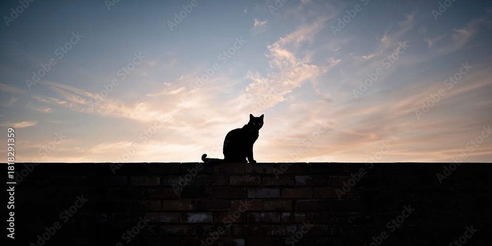 Fototapeta Koty - Black feline sitting on a wall, emphasizing urban wildlife observation #1818291359