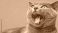 • Gray cat with wide-open mouth and yellow eyes against orange background