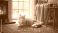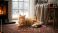 Fototapeta Koty - Orange cat by warm fireplace indoors. #1867653739
