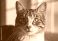 • Closeup of tabby cat with green eyes looking directly forward feline whiskers
