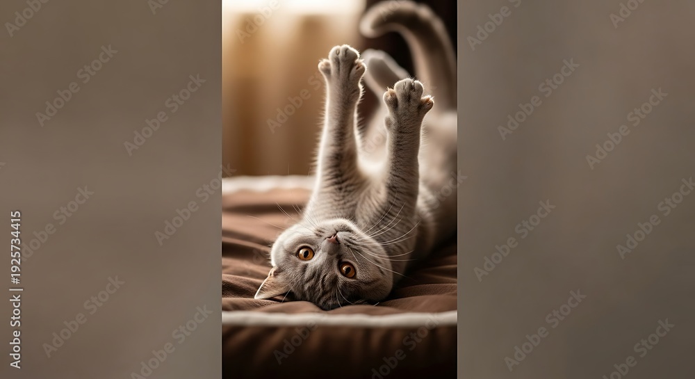 Fototapeta Koty - Adorable Grey Cat Lying on Back. #1925734415