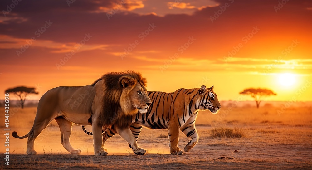 Fototapeta Koty - Lion and tiger walking together at sunset #1941485698