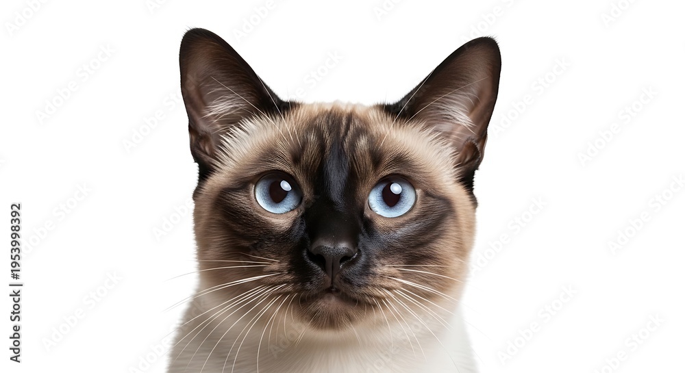 Fototapeta Koty - Close up of siamese cat face with blue eyes on white background feline animal #1953998392