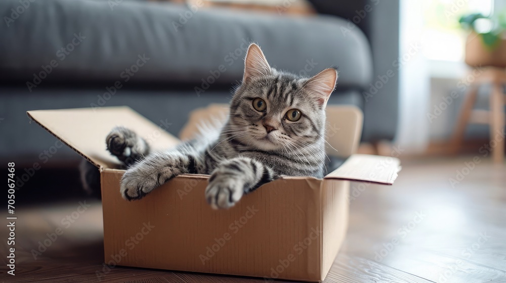 Fototapeta Koty - Cute grey tabby cat in cardboard box on floor at home #705067468