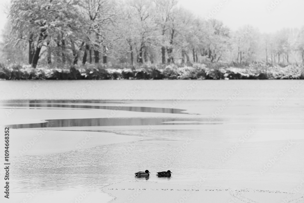 Fototapeta Pejzaże - Zimowy czarno biały krajobraz nad wodą. #1094668352