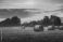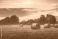 • Pomarańczowy letni wschód słońca nad polem, na którym leżą bale słomy