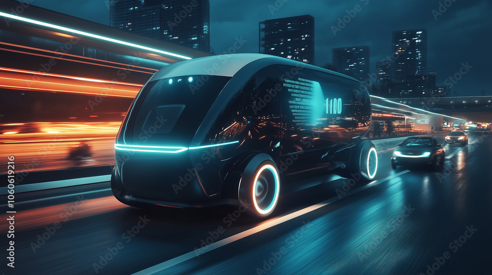 • Flota elektrycznych ciężarówek z modułowymi komorami jedzie synchronicznie wzdłuż autostrady, korzystając z AI do autonomicznej jazdy.