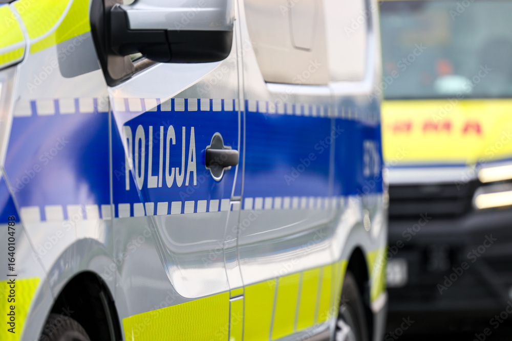 Fototapeta Pojazdy - Policja polska alarmowo wieczorem na ulicy. #1640104783