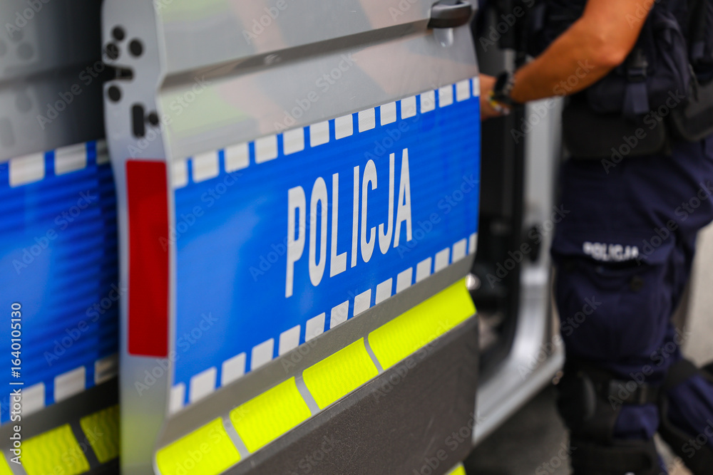 Fototapeta Pojazdy - Policja polska alarmowo wieczorem na ulicy. #1640105130