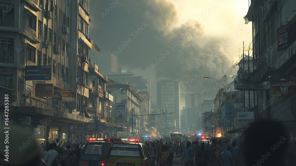 Fototapeta Pojazdy - Ataki terrorystyczne w centrum miasteczka na Bliskim Wschodzie, chaos na ulicach, wybuchy i... #1647285381
