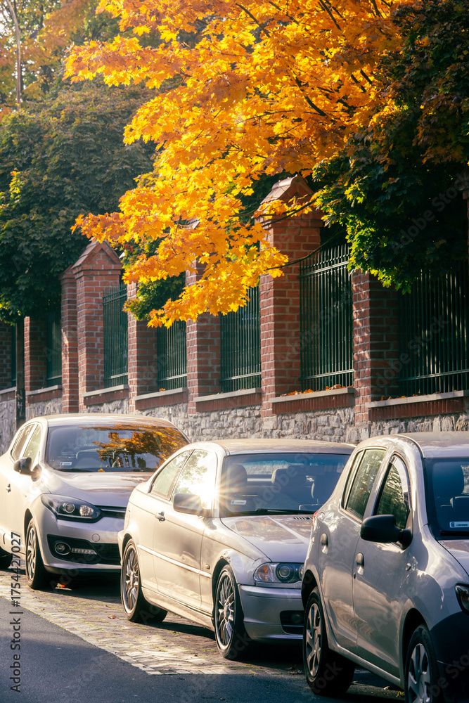 Fototapeta Pojazdy - Samochody zaparkowane przy ulicy pod jesiennym drzewem w słońcu w kolorach jesiennych #1754427027
