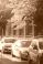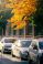 • Samochody zaparkowane przy ulicy pod jesiennym drzewem w słońcu w kolorach jesiennych