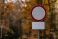 • Znak zakazu wjazdu na tle jesiennego parku – koncepcja ograniczeń i przepisów ruchu drogowego