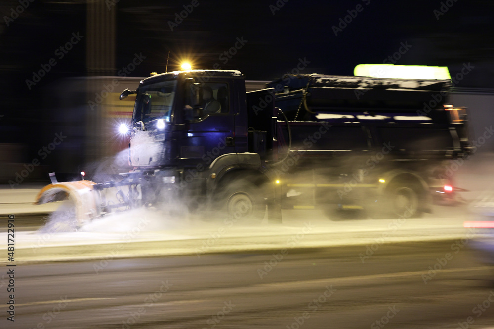 Fototapeta Pojazdy - Pojazdy pług i piaskarka na drodze po nocnych opadach śniegu w mieście i ruch pojazdów. #481722916