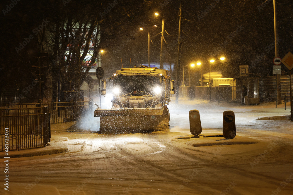 Fototapeta Pojazdy - Pojazdy pług i piaskarka na drodze po nocnych opadach śniegu w mieście i ruch pojazdów. #481723071