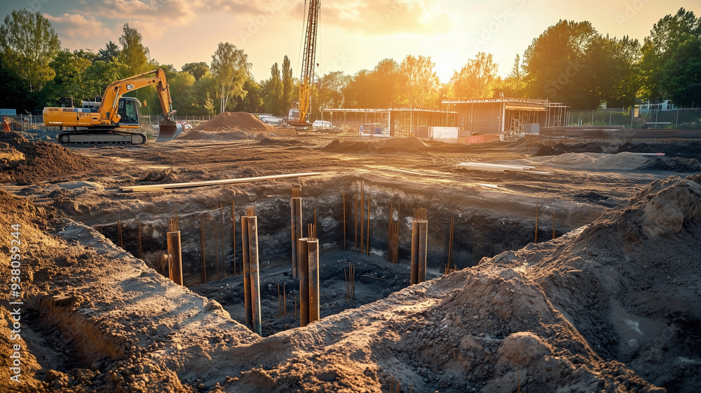 Fototapeta Pojazdy - Wykonywanie fundamentów na placu budowy z widocznymi maszynami i wyposażeniem w tle, otoczone... #938059244