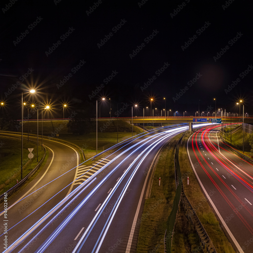Fototapeta Pojazdy - Long Exposure of a Highway Off-Ramp at Night in Brzesko with Car Lights Trail | Długi czar... #946024961