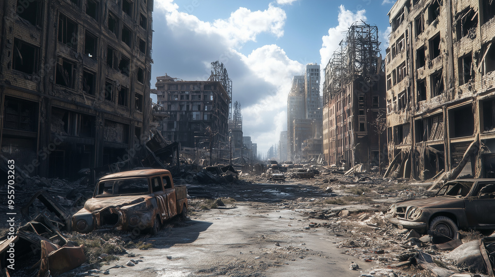 Fototapeta Pojazdy - Scena zniszczonego miasta po apokalipsie, gdzie spalone pojazdy leżą na zrujnowanych ulicach, a... #955703263