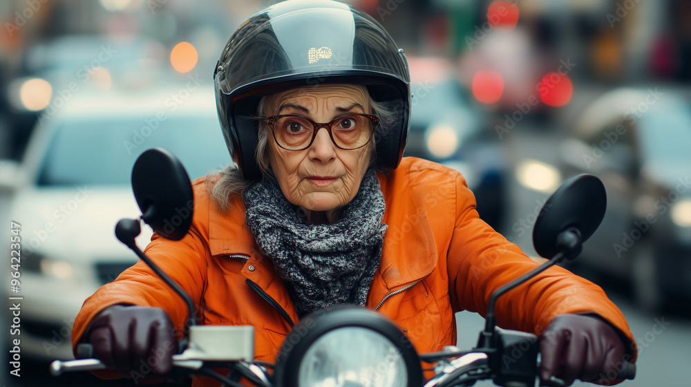 Fototapeta Pojazdy - Starsza kobieta z lękiem w oczach, walczącą z intensywnym ruchem miejskim na motorze. #964223547