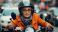 Starsza kobieta z lękiem w oczach, walczącą z intensywnym ruchem miejskim na motorze.