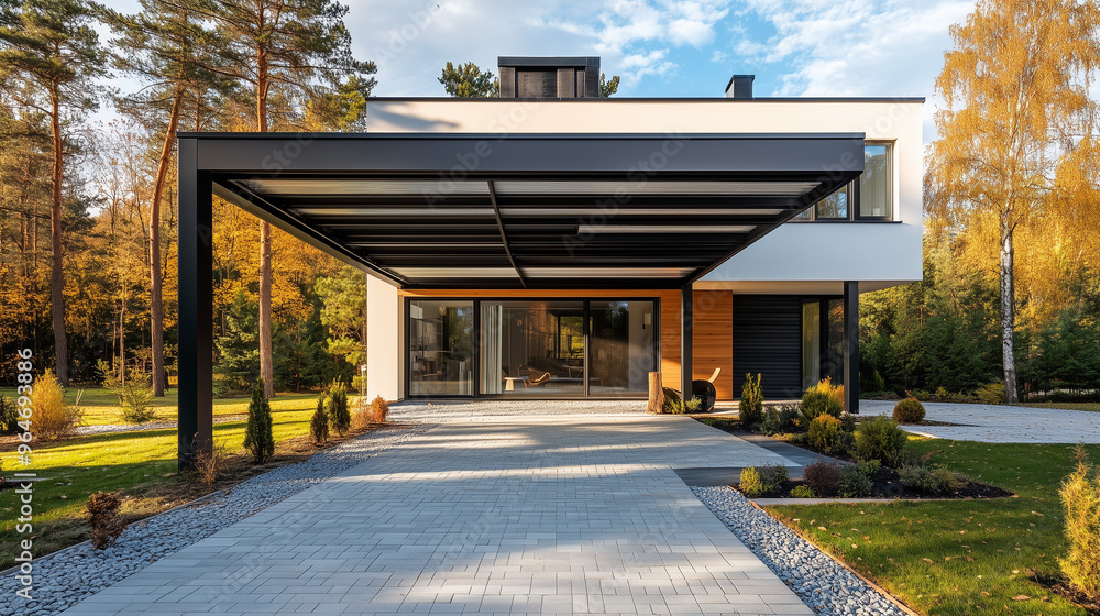 Fototapeta Pojazdy - Nowoczesna stalowa wiata samochodowa osłania pojazdy, stojąc obok stylowego domu. #964693886